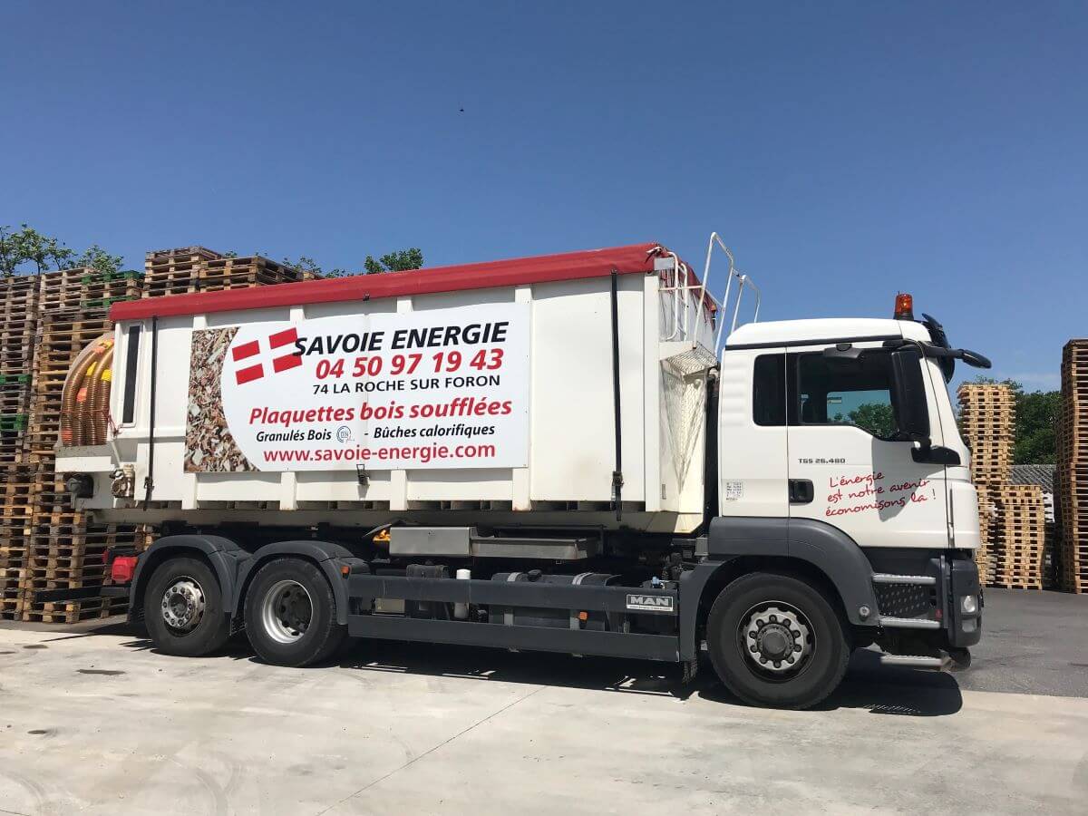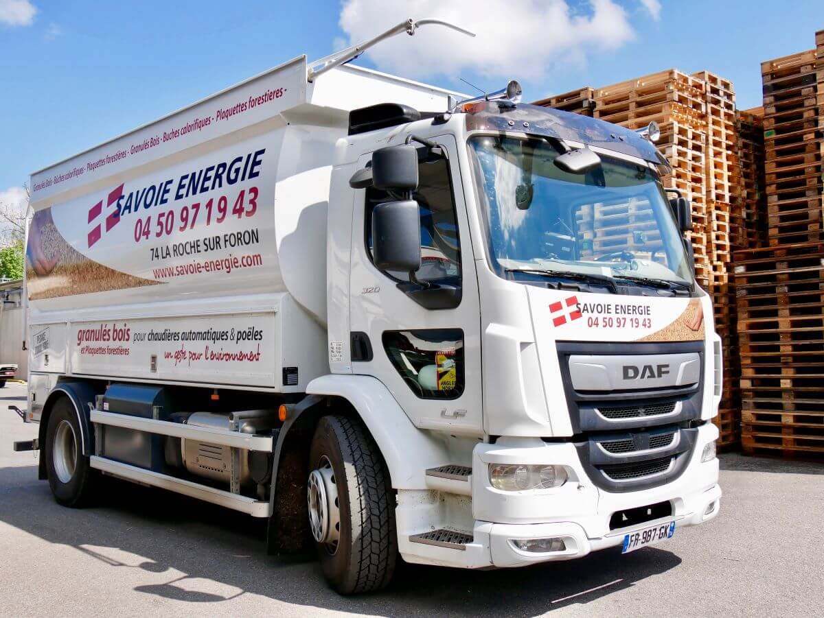 Notre camion dédié à la livraison de vos palettes de sacs de granulés et de bûches calorifiques vous permet d’avoir à domicile votre stock pour l’hiver !